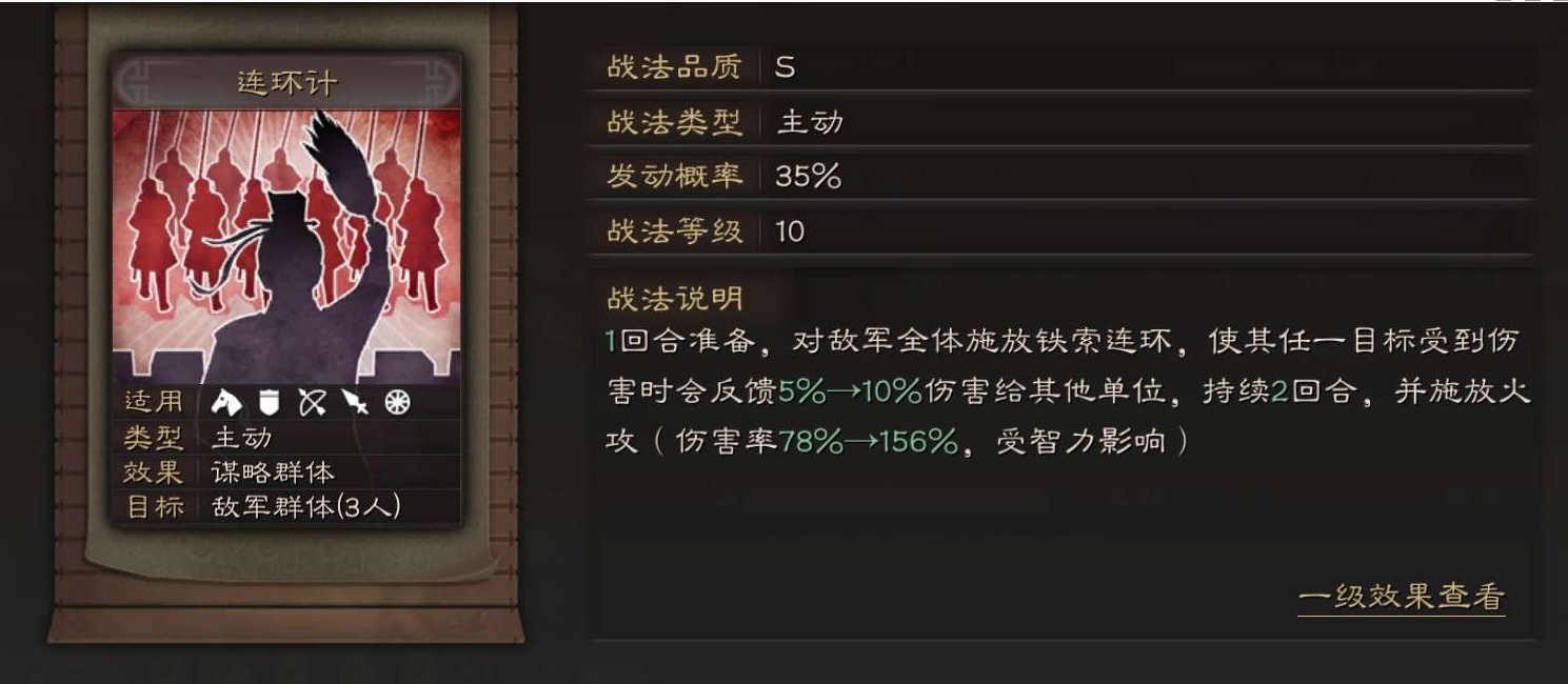1回合准备,对敌军全体施放铁索连环,使其任一目标受到伤害时会反馈5%→10%伤害给其他单位,持续2回合,并施放火攻(伤害率78% → 156%,受智力影响)