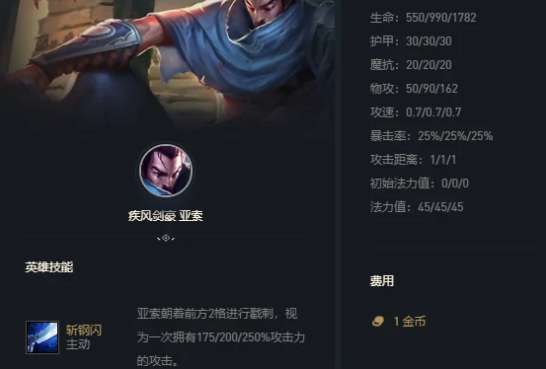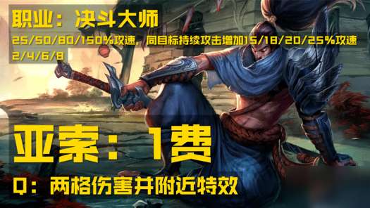 亚索在云顶之弈中身份我1费卡,它的天选可以很早刷出来,前期有很容易3星,后期搭配上永恩伤害非常高。