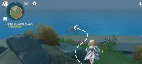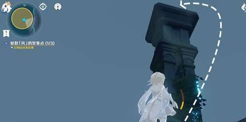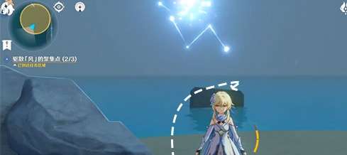 来到这个河边上的石柱子上面,此时开启元素之眼。可以看到。