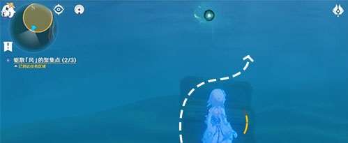 然后玩家攻击一下就会消失,需要玩家切换成为一个冰属性的角色,然后使用冰技能,就可以把水冻住,往前走几步,开启这个元素视野,然后就可以找到这个小黑球,也就是风的聚集点,之后就能顺利的切换成为风角色攻击完成收集。