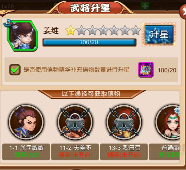 要通关副本1-8就可以愉快的开启武将升星啦。武将升星需要什么呢?举个例子:武将姜维初始星级为一星,那么要想将武将姜维升星到二星需要什么条件呢?很简单,武将姜维的信物20个或者信物精华20呢。武将信物和信物精华是可以搭配使用的呢。当然啦,只有足够数量的武将信物或信物精华也是不可以升星哒,你还需要一样东西,没错,就是铜钱!