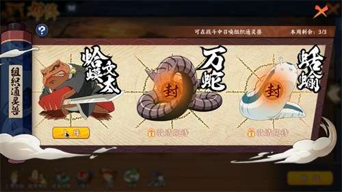 通灵术等级提升至10级后,学员在布阵界面则可以选择组织通灵兽加入战斗,进入战斗后,学员可点击召唤组织通灵兽来让其加入战斗。目前登场的蛤蟆文太是一个输出型组织通灵兽,它的奥义水遁·铁炮玉进场时立刻释放,可以对敌阵营所有单位造成伤害,普通攻击也可以对敌方5体造成伤害。组织通灵兽的召唤次数每周3次,在玩法中成功召唤并且战斗获胜后扣除次数,失败不扣除,召唤次数每周一凌晨5:00重置。