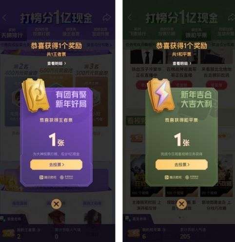 除了这些福利之外,最重要的当然就是money啦。在春节期间,只要参与了微视的活动,就可以投票打榜,瓜分1亿现金。跟着你喜欢的大神,冲啊。