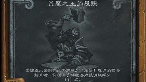 炎魔之王的恩赐,规则是在你的回合结束时,你的所有手牌法力值消耗减少(1)点,相当于每回合一个索瑞森大帝效果。