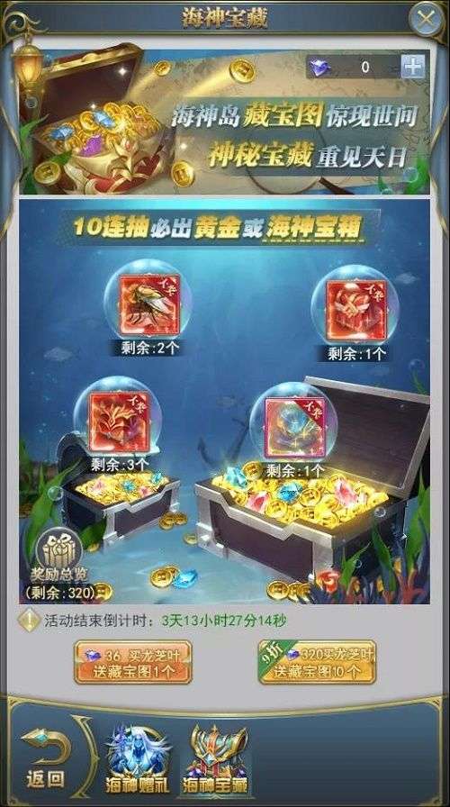 可通过单抽、十连抽(9折)进行海神岛寻宝。