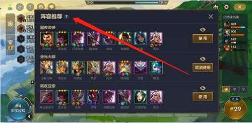 1、如上图所示,进入对局游戏后,点击右上角的左边第一个标志就可以查看阵容推荐了,然后根据自己需要就直接使用阵容推荐了。