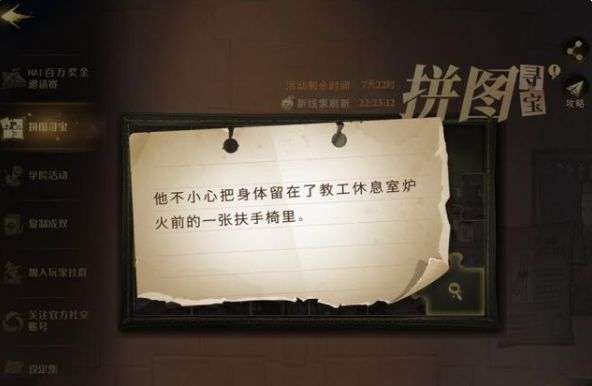 哈利波特10.12拼图寻宝第三个线索,他不小心把身体留在了教工休息室炉火前的一张扶手椅里,此为一个简单的要点,在什么地方可以找到对应线索的位置,具体还是看下面的流程,哈利波特他不小心把身体留在了教工休息室炉火前线索怎么找。