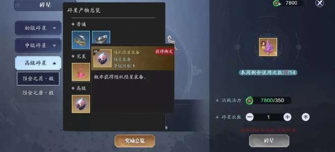 这是分解最低等级蓝色玉石的奖励。每周最多碎星14次,每次需要350点活力,地焰加成星运为七煞。第二周开始就可以达到9级分解金色玉石,主要是产出琉璃火,并且概率分解出高级战备装备,可让你在【陨星之战】中更强。