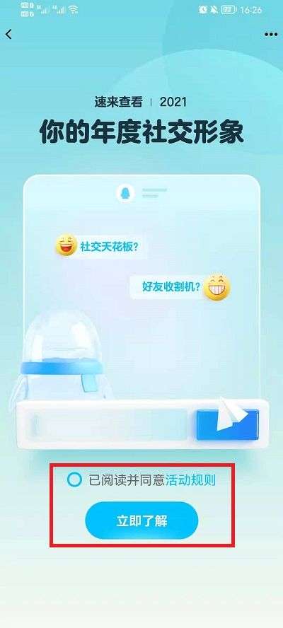 2、在查看之前需要我们同意活动的规则,就是授权让QQ总结我们的数据,然后去生成总结报告,还有社交形象;