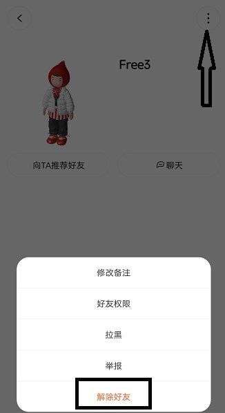 4、在好友信息界面点击右上角位置的【...】,之后下方会弹出下拉框,点击其中的【解除好友】即可删除。