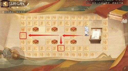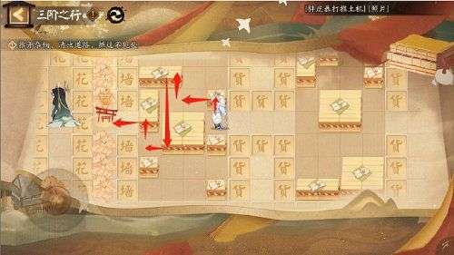 三阶之行玩法跟推箱子差不多,玩家在挑战这个关卡的时候可以线一直往前走,到了们的地方停下,找到鸟居的地方可以触发剧情,紧接着就能推开杂物找到一条路,直接按照下方图中的这个路线走即可通关。
