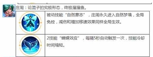 庄周永久进入自然梦境,全局免控,减伤和增加移速效果同样全局生效。