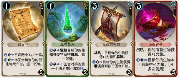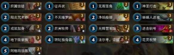 【征兵状】作为衍生物卡组的过牌引擎,更是重要得不能再重要了。【无暇圣角】是最佳的铺场辅助神器,更是不用多说。【光辉营军旗】主要用于解场,给衍生物嘲讽也可以浪费对手的攻击频率。【进击铜号】是卡组的一大爆发点,上场即可提供爆炸的伤害。