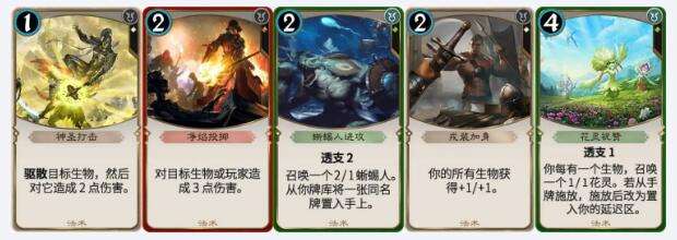 【神圣打击】和【净焰投掷】并称为低费最强的单解,【神圣打击】可以破帷幕可以解buff,对付深绿buff套牌不要太好用,日常单杀【基础型卡拉诺】更是手到擒来。【净焰投掷】的优势在于低费和灵活,可以解场可以打脸,基本挑不出毛病。【蜥蜴人进攻】作为铺场解场于一体的低费法术,透支2的特效还能非常方便得配合【转轮独角兽】。【戎装加身】作为衍生物卡组的看家法术,属于稳定阵脚、组织进攻的必备神器。【花灵祝赞】作为一张提升铺场速度的中期铺场卡,2段式的铺场能增强对清场的抗性。