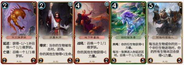 【炽翼信徒】是优质的1费生物,如果吃到buff会非常厉害。【炎阳咒术师】主要配合己方的各种低费法术清场,保护己方生物方便后期爆发。【不灭维罗妖】作为最适合衍生思路的红色生物,标准的身材和出色的赖场能力是他的资本。【炽翼牧师】是各类混白铺场卡组中的一霸,加1血的光环非常有利于保护己方场面。与其相对的,【地下街豪族】则是群体加攻,也是卡组中的一个爆发点。【转轮独角兽】是衍生物卡组的中期核心,一张卡集站场、铺场和buff于一体,真的不能要求更多。【法尔考】是常用的白色嘲讽生物,用于保护己方场面。最后的【阿格玛领路人】是卡组最大的爆发点,配合各种小生物真是伤害爆炸。