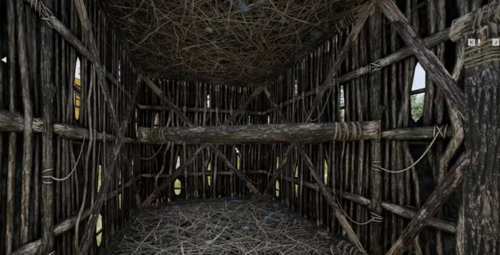 最开始的时候,咱们先建一个1x2的小房子用来开荒。进去之后在里面搭一个三角板,这样空间就会大一些,能多放几个箱子。把领地柜放好,一个简单的开荒房就完成了。等手里稍微有点材料了,就可以开始往外扩了。