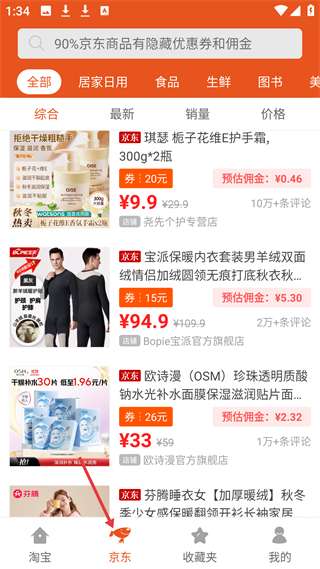 2、京东页展示居家日用等分类商品,如护手霜等,标注价格、优惠券及预估佣金,可按综合、销量、价格排序。