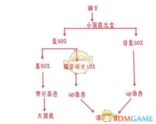4、小保底原本有 50% 的概率出当期的 UP 角色,在5.0版本之后,因为“捕获明光”机制的存在,小保底不歪,出当期UP角色的概率提升到了 55%。