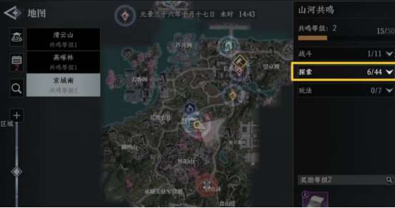 探索点极其丰富,其中就包括山河碑,在主界面右上角寻找到左侧的搜索栏,即可在该区域自由搜索并激活发现各种未知区域。在探索的过程当中可能会遇到很多元素蓝色字体地图上就会亮起对应的区域,直接前往寻找到npc完成各种职责,就能够成功探索并获得丰厚的奖励。