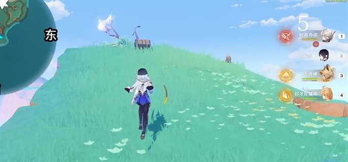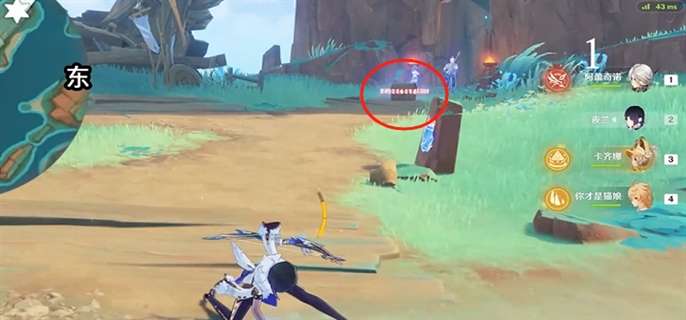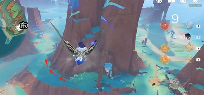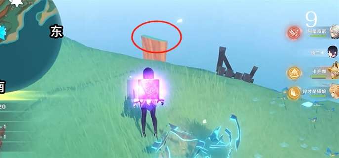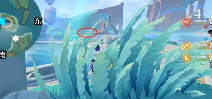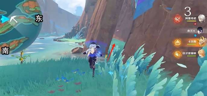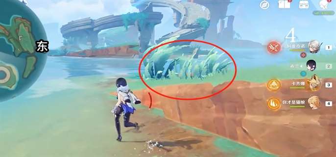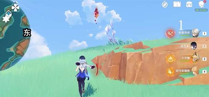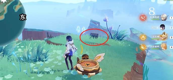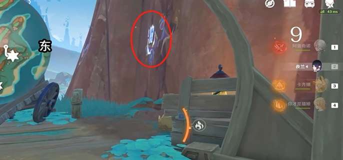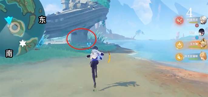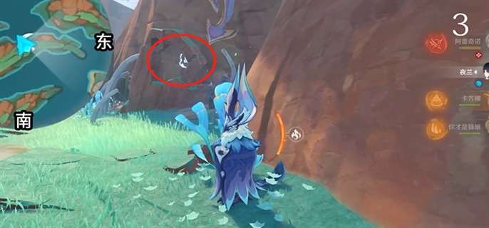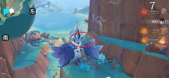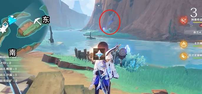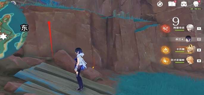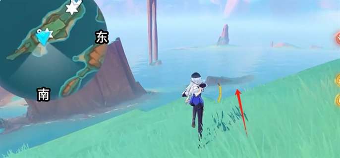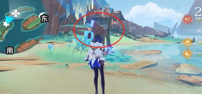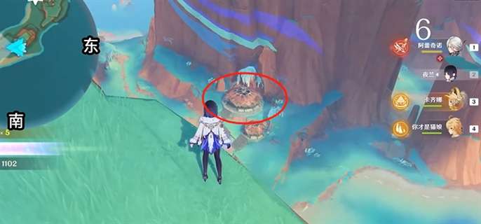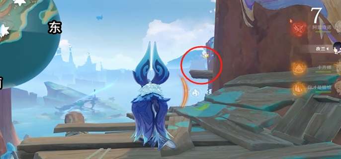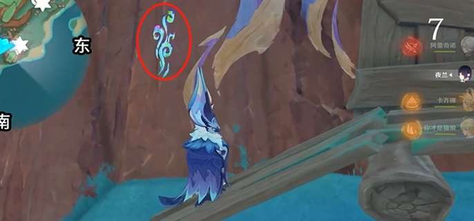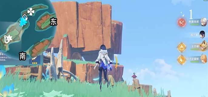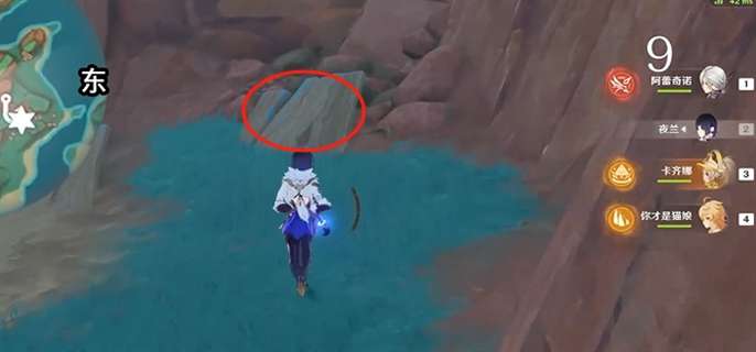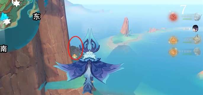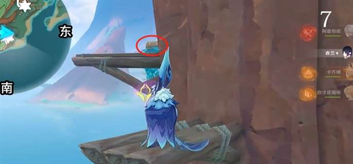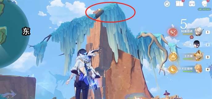 3、小地图西南方向,需要到达山顶上面,可以从左前方的石柱上去,到达山顶后,可以看到正前方有个神瞳(可以拿出岩主垫下脚);