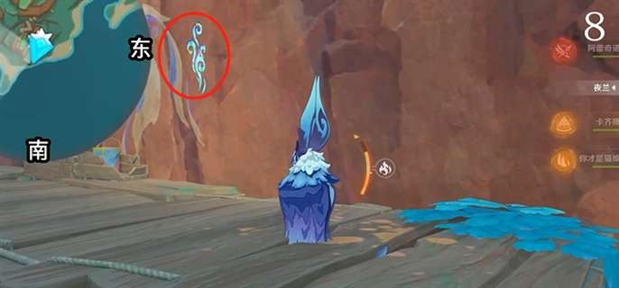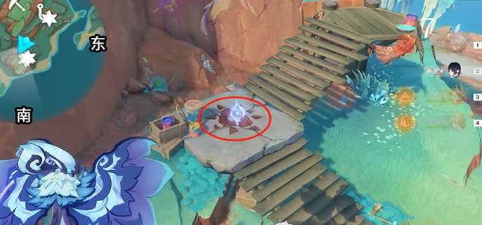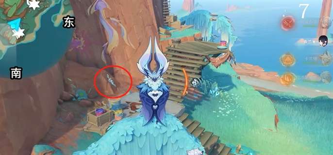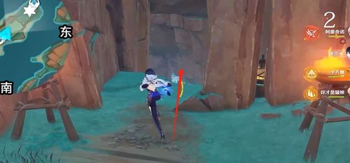 点击石盒后,小地图东北方向,需要沿着山体左侧走,达到木板位置处;