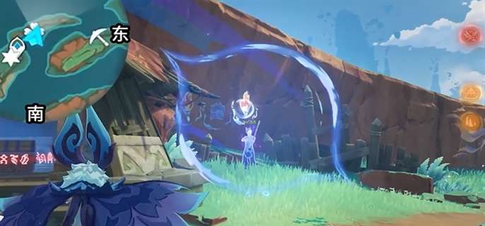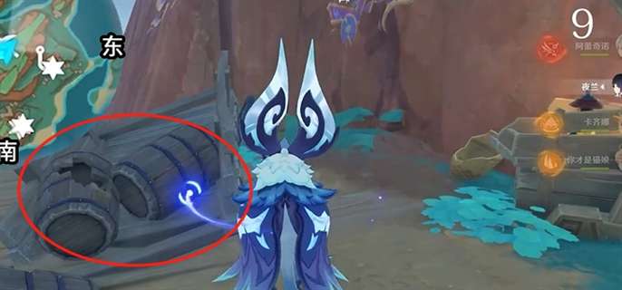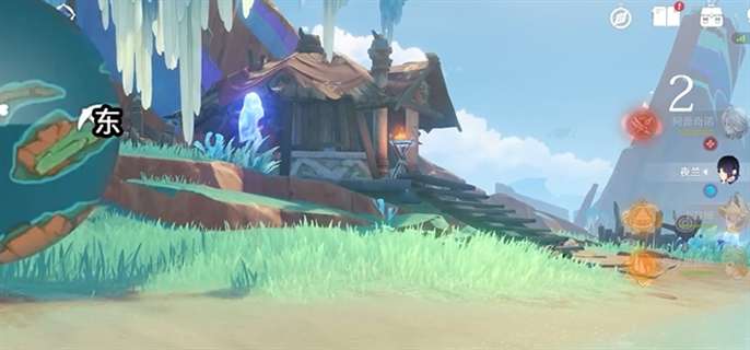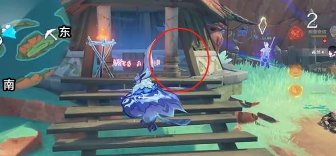 9、西方向,在如图位置寨子屋顶上方有一个神瞳,寨子门口把怪打了可以获得宝箱;