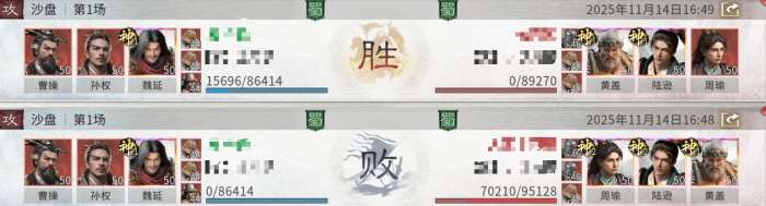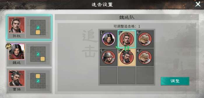 英雄站位:魏延无需站追击格,曹操站孙权以及魏延的追击格,可以二次发动追击技能,孙权站曹操的追击格。(这里要注意的是,三位英雄都需升阶鎏金才能修改成图片中的追击格)