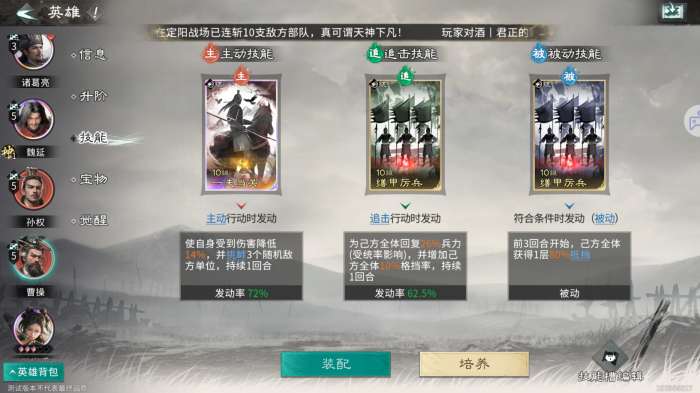 被动技能:依旧推荐携带缮加厉兵,前3回合开始,己方全体获得1层80%抵挡,可以大幅度提升我军前期的坦度。