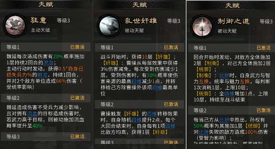 队伍思路为:战斗开始时曹操发动【乱世奸雄】为自身施加十层【奸雄】,从而获得30%的伤害减免,且每次受到伤害,有概率使伤害来源减少最高四维属性,并转移给己方除曹操外的该项四维最高的单位。孙权发动【制御之道】给己方全体施加【统御】,提升己方全体的四维属性,可以让魏延在触发自带天赋【狂意】时有更大概率给敌方施加【流血】效果。