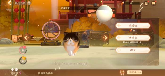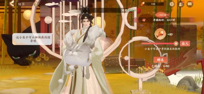 随着主线剧情的展开,使君会被赠送一只三花猫,而随后的猫咪就需要陆游去外出寻觅获得,每次耗时24小时,回来后会停留半小时,这期间可以赠送小鱼干礼物来减少等待时间,更有机会获得衔蝉奴等稀有猫灵~