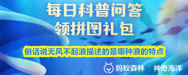 俗话说“无风不起浪”,描述的是哪种浪的特点?【神奇海洋】12月24日新题目已开答!正确答案现已公布,点击领取拼图,一起为修复海洋生态贡献力量!今日正确答案是:【风浪】。“无风不起浪”描述的是风浪的特点,风浪是由局地风直接作用并维持的海面波动。