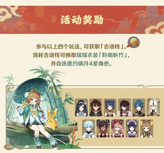 参与以上四个玩法,可获取「吉语钱」。消耗吉语钱可换取瑶瑶衣装「聆雨听竹」,并自选邀约璃月4星角色。