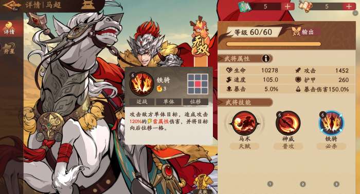 马超是隶属蜀国的无双英雄,定位是近战和单体输出,而且具有特色的雷电元素属性伤害,同时对单体命中以后还会将其击退一格,很符合其骑马作战的特性。