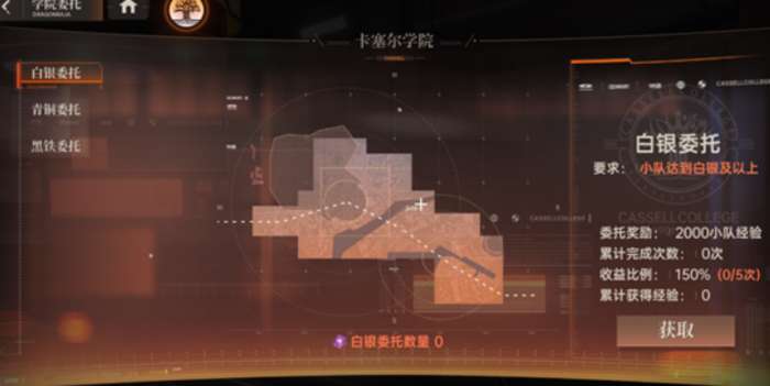 第二个功能是学院委托,同样在达到黑铁I之后开放。这个玩法需要消耗委托函来接取不同难度的委托任务,完成后能拿到历练经验作为回报。委托的等级越高,给的经验自然就越多,但有个限制条件,就是不能接取超过自身评级段位的委托。比如现在还停留在青铜段位,就没办法去做白银级的委托任务。委托函的来源比较广泛,参与各种玩法基本都有机会获得。