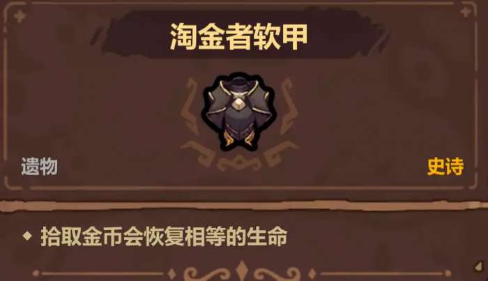 淘金者软甲,捡钱回血,淘金者套件之一。32血购买,回血这个属性前期比较有用,成型之后主要是两个作用,一个是可以凑淘金者套装去碰瓷刷钱,另一个比较看运气,第二层找到注魔硬币法术,第三、四层找到抽奖密室,配合这个遗物可以一直抽奖抽到血量消耗大于血量上限为止,大量获取资源。