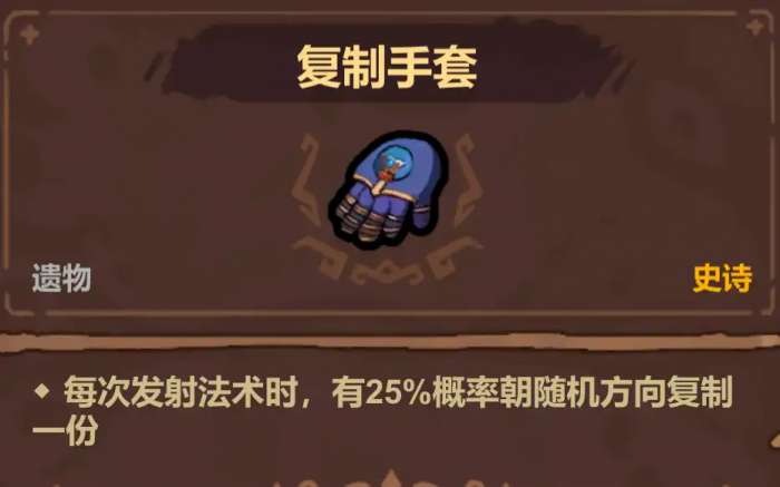 复制手套,有概率复制法术,最高两级,一级25%二级45%。28血购买,优点是概率复制一份法术,缺点是随机方向发射,胜在不需要太多血量,拿了有用,不拿影响也不大。