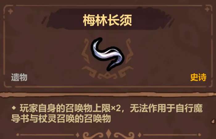 梅林长须,召唤物上限*2,梅林套装组件之一。80血购买,召唤流必拿,不玩召唤流拿了没用,只能凑个梅林套装。