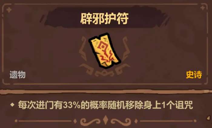 辟邪护符,进门后有概率移除身上1个诅咒。48血购买,触发玄学,作用玄学,当前版本有些诅咒并不是完全的负面效果,部分诅咒利用得当可以变成完全的正面效果,并且该遗物与嗜咒者面具冲突,血多可以考虑拿,但是也有可能变内鬼。