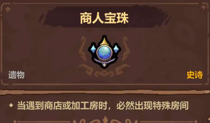 商人宝珠,在商店中提供药水商店,在加工房提供四合一升星。77血购买,当前版本药水效果非常强,而商店特殊房间会提供6瓶药水,血量足够的情况下可以考虑购买,游玩炼金师套装时强烈推荐购买。