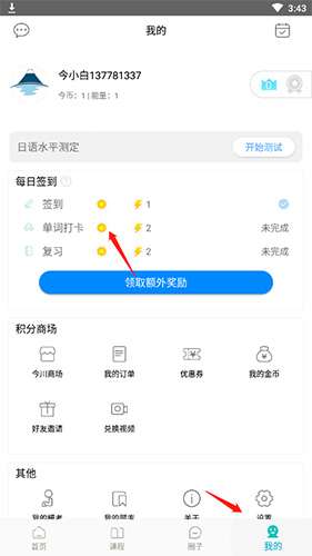 打开今川日语点击底部功能栏最右侧的【我的】按钮,进入个人中心后找到【单词打卡】功能,完成每日设定的单词背诵任务即可完成打卡;若参与日语训练营,可在首页下方中间的人形图标进入个人中心,点击日历上当天日期进行打卡。
