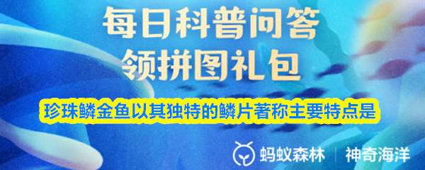 珍珠鳞金鱼以其独特的鳞片著称,主要特点是?【神奇海洋】10月23日新题目已开答!正确答案现已公布,点击领取拼图,一起为修复海洋生态贡献力量!今日正确答案是:【鳞片呈珍珠状】。珍珠鳞金鱼因其身上具有珍珠般的鳞片而闻名。