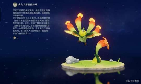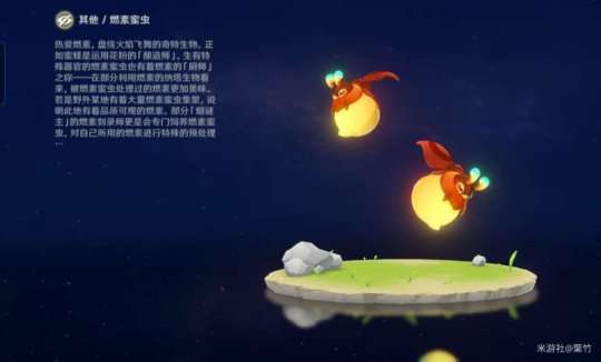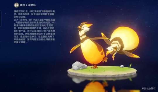 传送流炎地下河的锚点(地下),视角向右边转,燃素河(湖?)的岸边有一只,不可捕捉,不可伤害,可以上去a一下开图鉴。没有开锚点的同学们可以传送到流泉之众的七天神像,跳下眼前的洞口,接任务,跟着任务开锚点,浮燃鸟和燃素蜜虫应该都是只出现在有液态燃素的地方(我没有在其他地方发现过)。