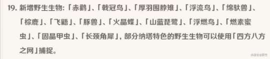 5.0新版本生物志更新了14种野生生物:「赤鹮」「戟冠鸟」「厚羽围脖雉」「浮流鸟」「绵驮兽」「棕鹿」「飞鼯」「豚兽」「火晶蝶」「山蓝琵鹭」「浮燃鸟」「燃素蜜虫」「固晶甲虫」「长颈角犀」。其中山蓝琵鹭、浮燃鸟、长颈角犀、燃素蜜虫与固晶甲虫不可以用四方八方之网捕捉。