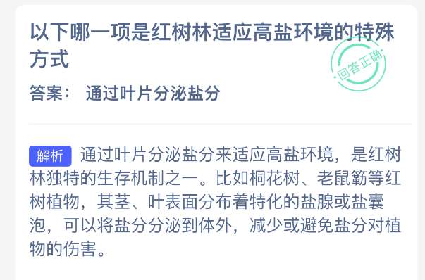 以下哪一项是红树林适应高盐环境的特殊方式?【神奇海洋】12月14日新题目已开答!正确答案现已公布,点击领取拼图,一起为修复海洋生态贡献力量!今日正确答案是:【通过叶片分泌盐分】。通过叶片分泌盐分来适应高盐环境,是红树林独特的生存机制之一。