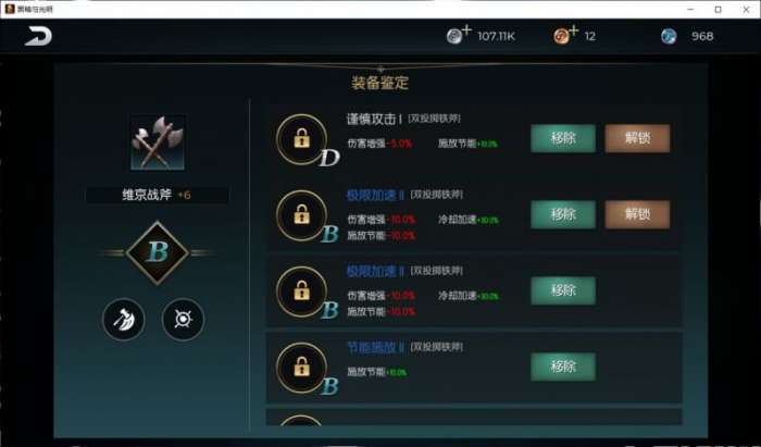 当我们装备改造达到四级以后,就可以花费一定的材料鉴定出两条关于技能加强的词条,六级以后可以再鉴定两条,八级以后再鉴定两条。当前装备可以鉴定出一共六条词条。