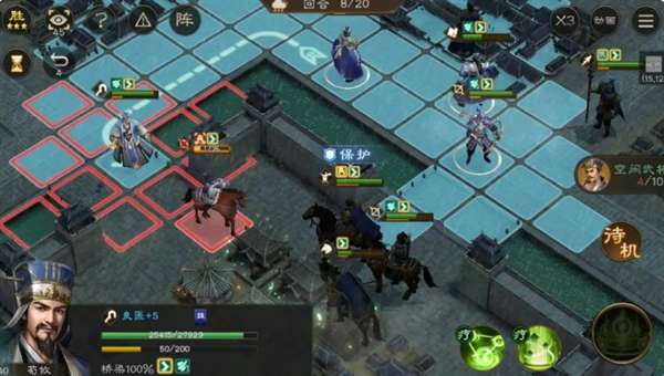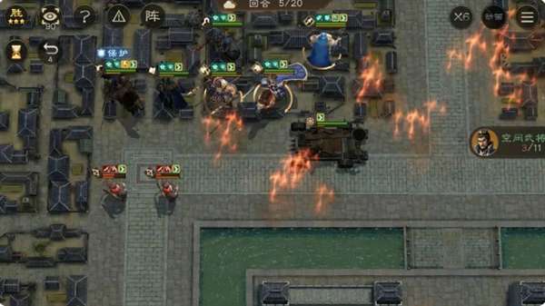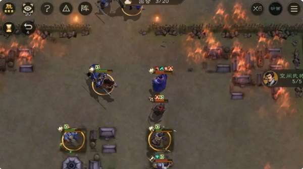 这一关要八回合之前并且无撤退还是有些难度的,回合数比较紧并且我军没肉盾系角色,注意抗伤与聚怪。开局全军向右上进军,不用担心触发不了单挑,下方的不用管,进城后敌军会全军出击。