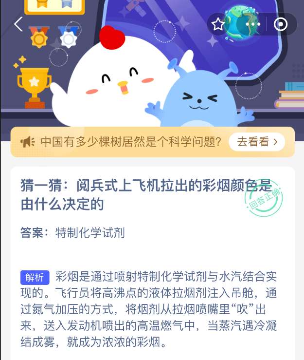 猜一猜:阅兵式上飞机拉出的彩烟颜色是由什么决定的?支付宝小鸡课堂开课啦!每天花一分钟答题赚饲料,喂喂小鸡就能贡献爱心啦!轻松又意义十足!2025年10月5日蚂蚁庄园的小鸡课堂题目正确答案是【特制化学试剂】,飞机表演用的彩色拉烟是通过特定的拉烟剂实现的。拉烟剂通常由环保型烟雾油和彩色染料组成.