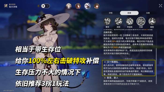 队伍带生存位时,大丽花可为自身以外队友提供“24%大丽花的击破特攻+50%”击破特攻增幅(100%左右),依旧还是多带个同谐主或阮梅输出更高,在多轮次求稳或难生存环境考虑。