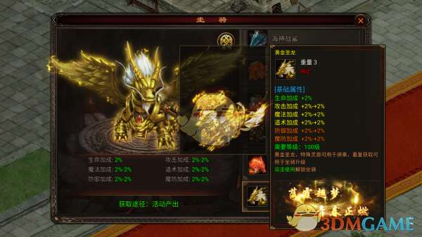 坐骑重复获取可用于坐骑升级。强化坐骑可提供高额攻血防、骑乘时移速增加,驰骋八方!