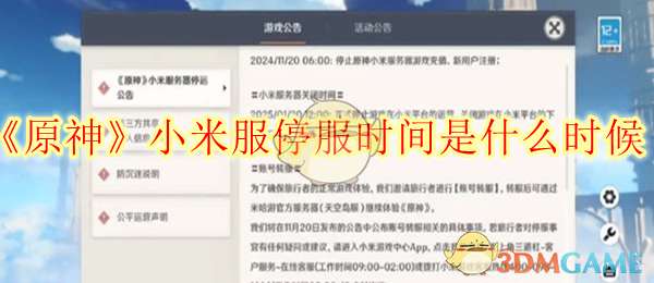 原神小米服停服时间是什么时候?就在近期原神小米服发布了停服的公告,而小米服目前也已经关闭了注册和充值的通道,很多玩小米服的玩家都想知道具体的停服时间,想提前做好转移到官服的准备,今天小编就带大家一起来看看详细的介绍吧。